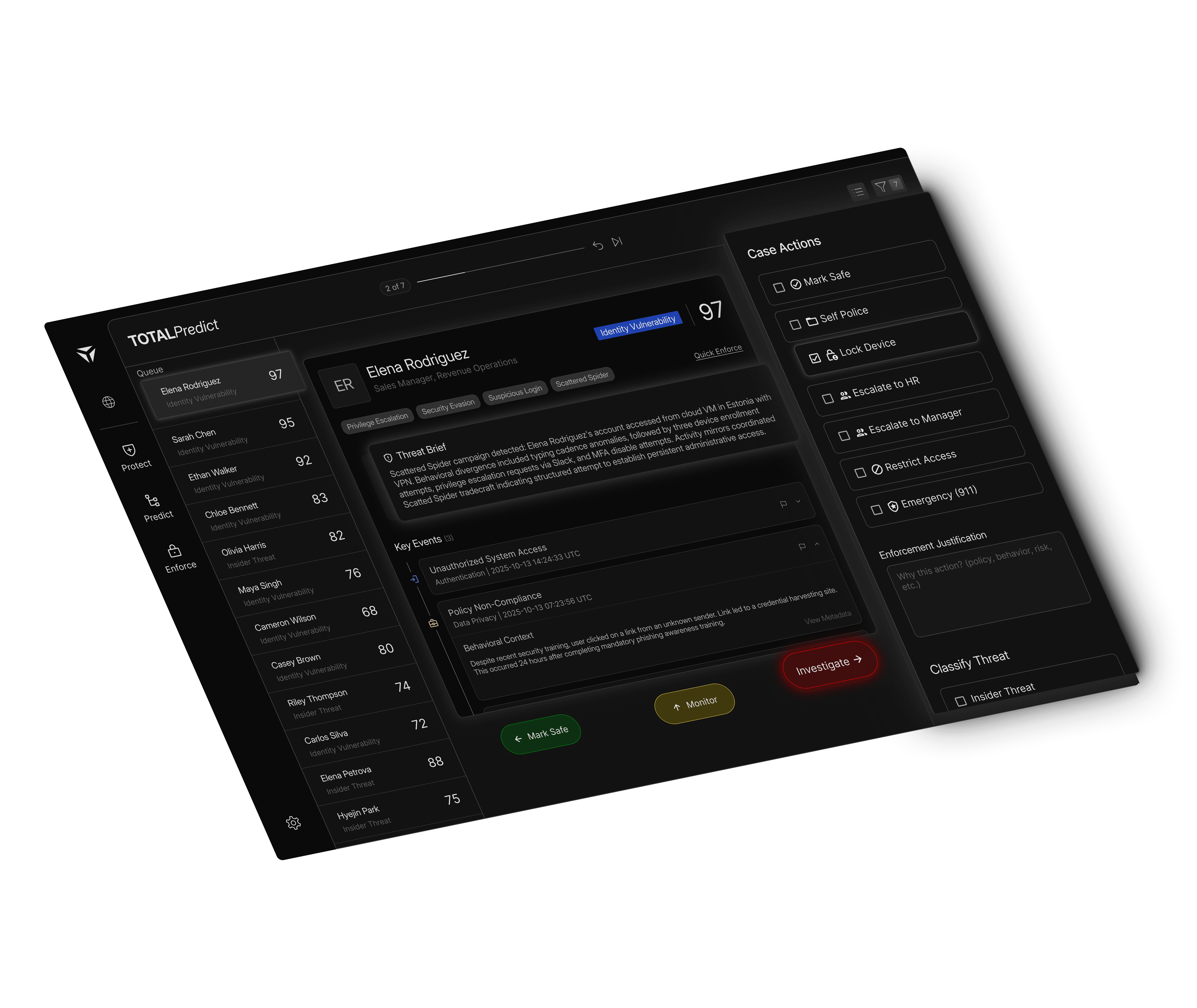 TOTAL redefines detection by understanding people, not just events. It builds a behavioral persona for every actor, learning how they work, when they access systems, and how they interact with data. This deep identity context transforms noisy events into clear narratives.